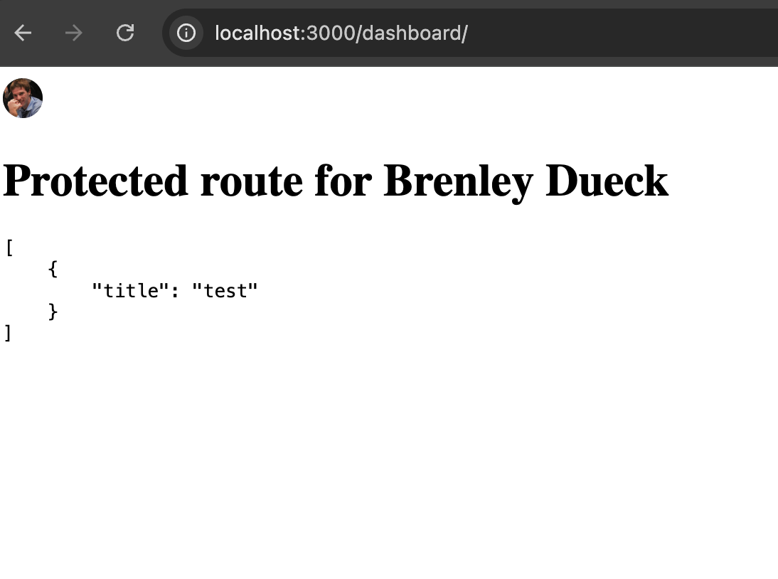 Now if you hit the dashboard page you should see an id in the server console. This could then be used to look up records in your database related to that specific user. This prevents you from even having to send the user info from the client to the server.